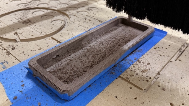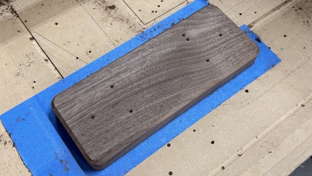 For the first operations I used the 1/2” bit to remove most of the material and then faced the top and sides. With the painters tape and super glue holding it down, I’m able to cut all the way to the spoil board.